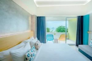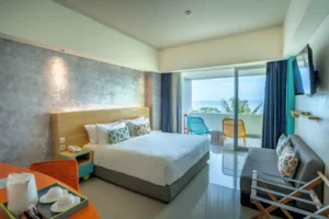The Deluxe Room with Sea View Terrace is positioned overlooking the beach and the sea. The intimate 31 square meters accommodations. Keeping up with the hotel’s artistic theme, the Deluxe Room with Sea View Terrace is enhanced with unique, sculptured furnishings and handmade decor. Rooms are equipped with a bathroom and shower with complimentary Wi-Fi, cable television, and other standard amenities.