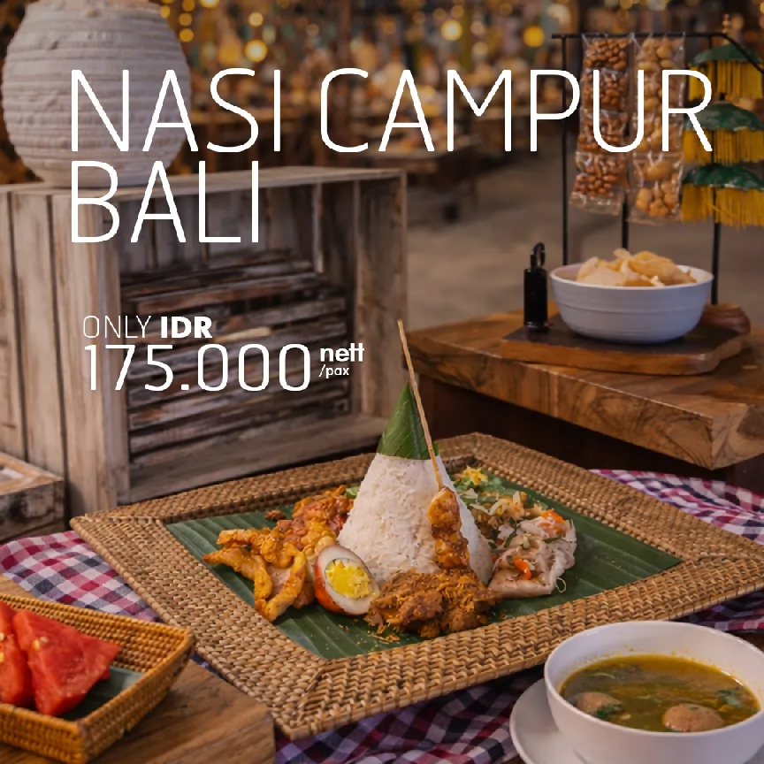 together authentic Balinese dishes—beef rendang, fish sambal matah, chicken satay, egg pindang, shredded beef, sweet tempeh, urab vegetables, and crispy chicken skin. Authentic flavors. One perfect plate.